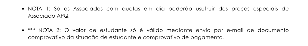 Qualquer desistência deverá ser comunicada para o email andreia.marques@apq.pt, até ao dia 15 de outubro. Até esta data haverá um reembolso de 75%. Após esta data não haverá lugar a reembolso.