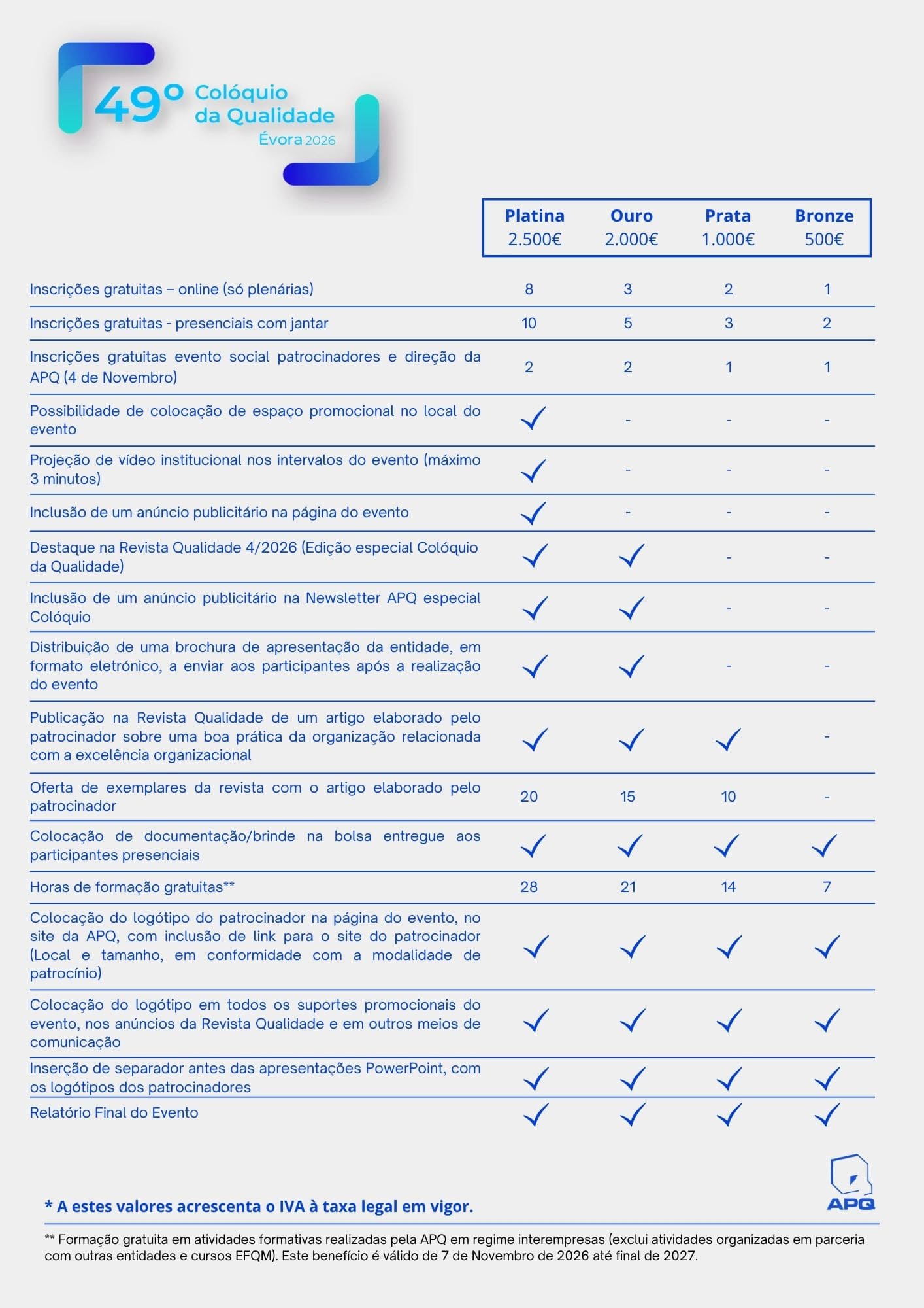 Qualquer desistência deverá ser comunicada para o email carla.cunha@apq.pt, até ao dia 15 de outubro. Até esta data haverá um reembolso de 75%. Após esta data não haverá lugar a reembolso.